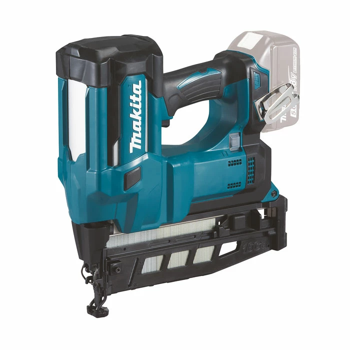 Dyckertpistol från Makita med en inbyggd kompressor som ger känslan av att skjuta med en tryckluftsdriven dyckertpistol. Avsedd för dyckert med diameter på 1,2 mm och längd på 15-50 mm (18Ga). Den är exemplarisk vid osynliga infästningar. Det finns val för singel- eller serieskott och en säkerhetsbrytare förhindrar oavsiktlig start av verktyget. Med LED-belysning får du en god sikt på arbetsstycket och med det ergonomiska och gummibeklädda handtaget får du en säker och komfortabel arbetsställning. Har dessutom ett skyddssystem som förlänger batteriets livslängd genom att stänga av maskinen när batterinivån blir för låg.