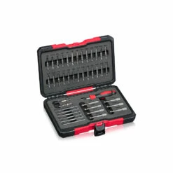 Hyls- och bitssats i 42 delar med hylsor, bits och tillbehör för olika sorters skruvhuvuden och muttrar.