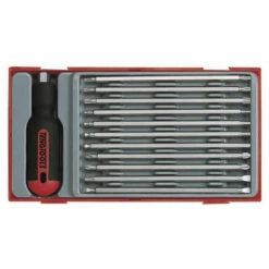 Skruvmejselsats från Teng Tools om 12 delar. Innehåller ett skruvmejselhandtag och 11 lösa vändbara skruvmejselklingor med en mejselspets i vardera ändan.