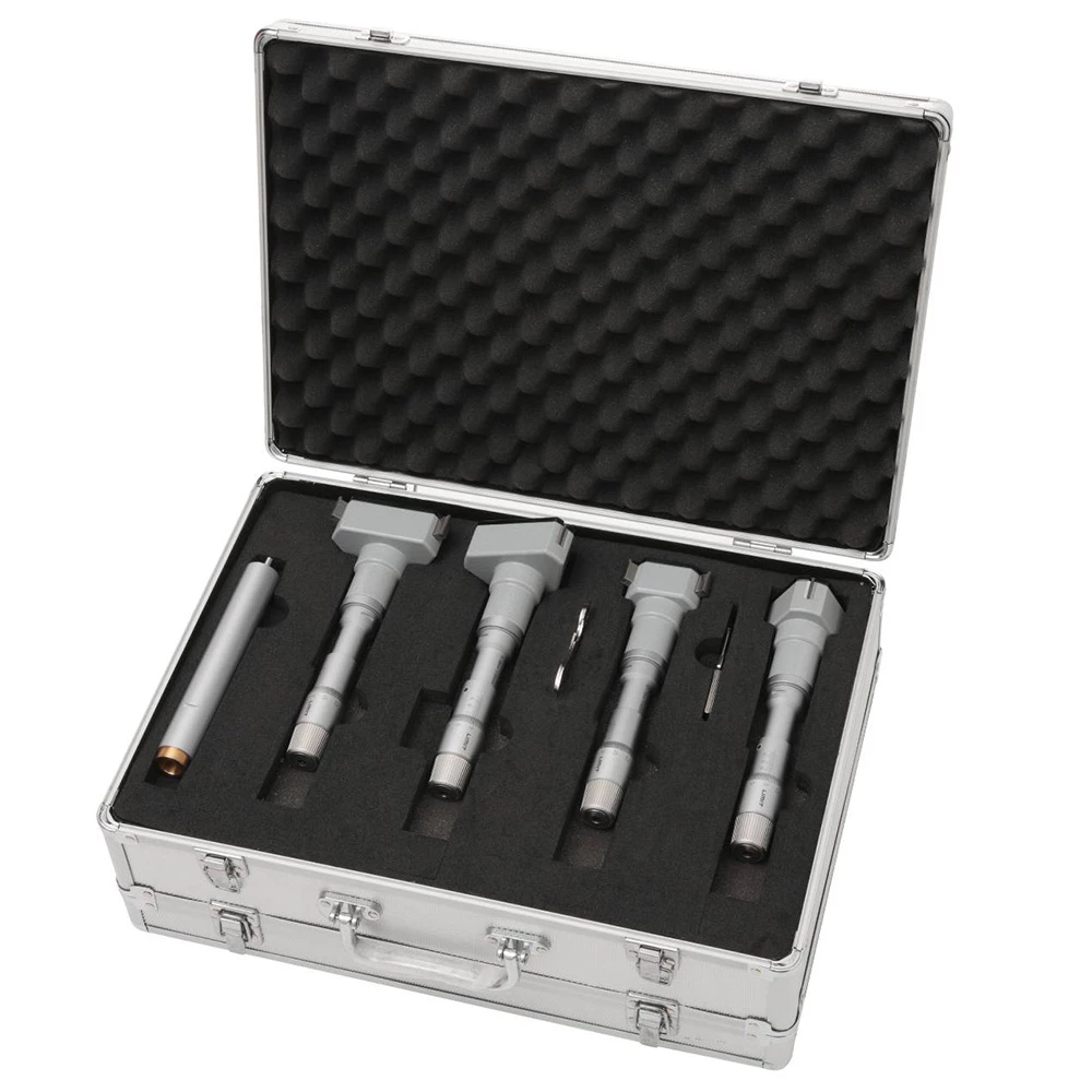 Trepunktsmikrometer och satser avsedd för hålmätning. Med friktionsanordning som ger en konstant mätkraft samt självcentrerar mätdonet. Mätytor av hårdmetall. Mätspetsarna når till 0.5 mm från botten av ett blint hål. Inställningsring ingår. Den ena satsen innehåller fyra mikrometrar i 20-50mm och andra satsen 63-100 mm samt 2 inställningsringar i varje sats. Levereras med förlängare och inställningsring.Tillverkad enligt DIN 863/4.